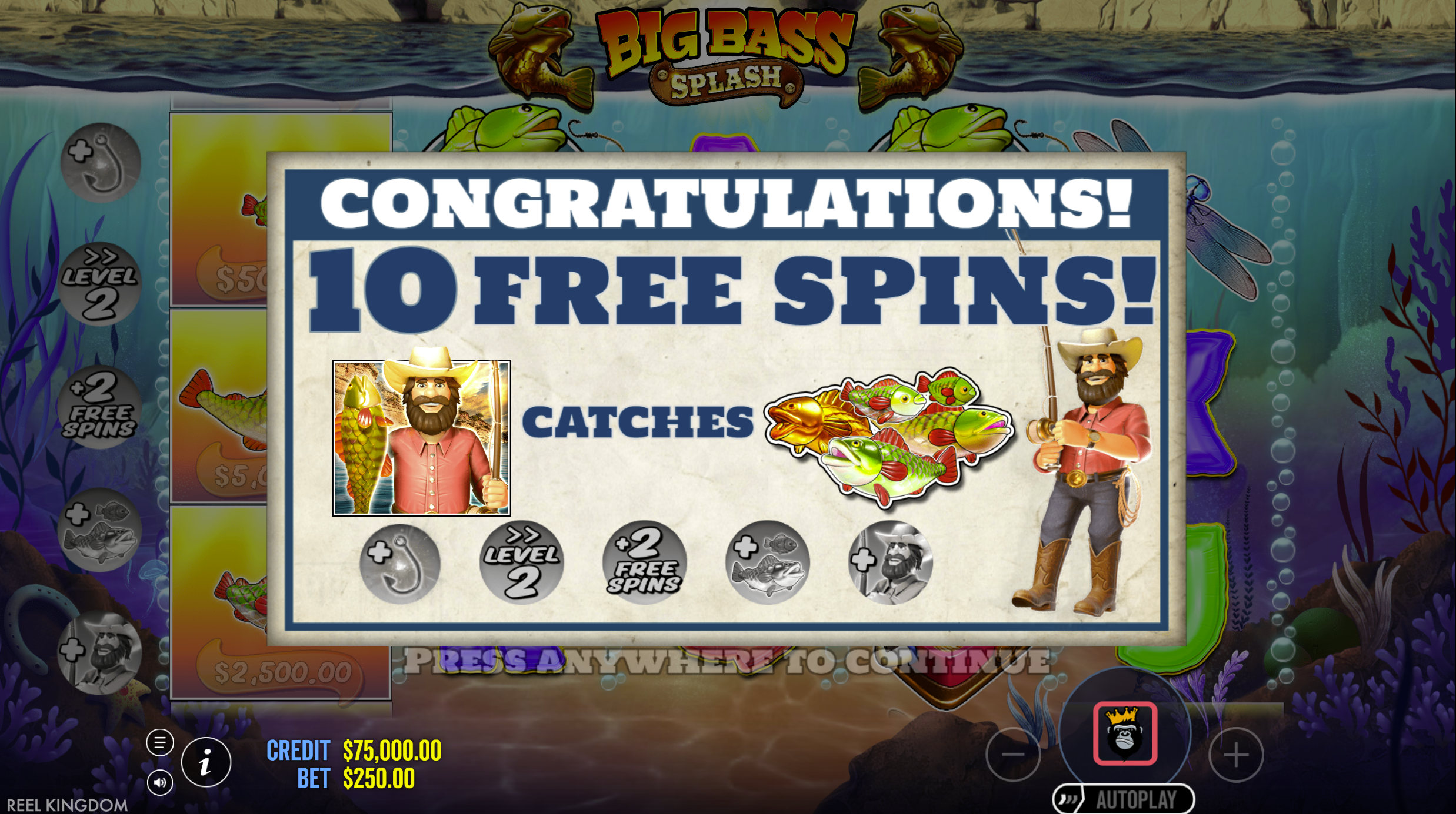 - Persistent Fisherman Wild: During free spins, Fisherman Wild remains fixed on reel 5 ensuring guaranteed collections